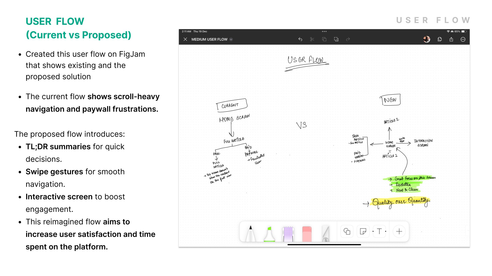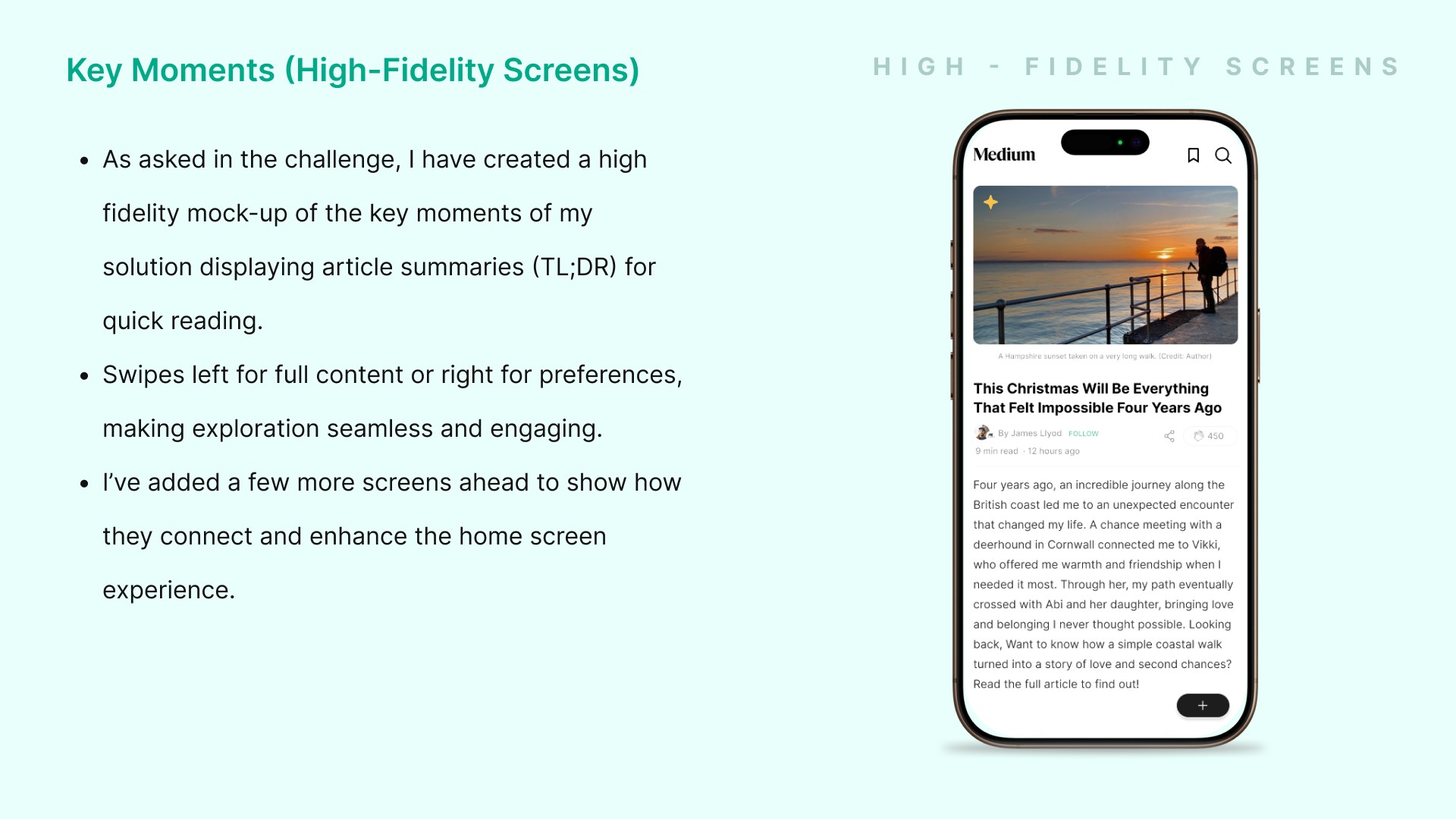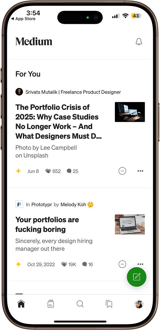 As a wide reader and aspiring writer, I love what Medium stands for—but I’ve always felt the platform’s experience could be more welcoming and distraction-free. So I reimagined it in my style. This personal project focuses on increasing time spent on the platform—for both writers and readers.